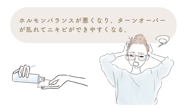 ホルモンバランスが悪くなり、ターンオーバーが乱れてニキビができやすくなる。