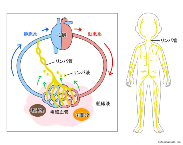 ・リンパ液=分子量の大きい乳酸などの疲労物質や老廃物を回収し、鎖骨下静脈の静脈角で 静脈と合流して心臓に戻る