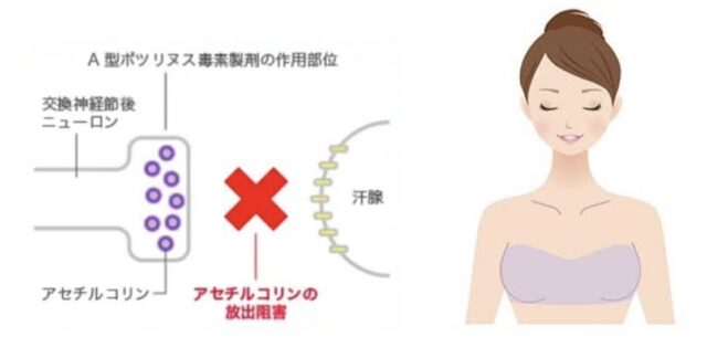 ボツリヌス毒素製剤はアセチルコリンの放出を阻害し、神経から汗腺への情報伝達を遮断することで発汗を抑制します。効果は2~3日で出始め、通常4~9ヵ月持続とデータが出ています。(個人差があります。)