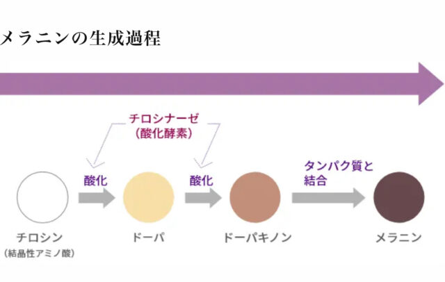 チロシンはメラノサイト内の酸化酵素によって黒色メラニンになります。ビタミンCとEはこの酸化を抑え、シミをできにくくします。