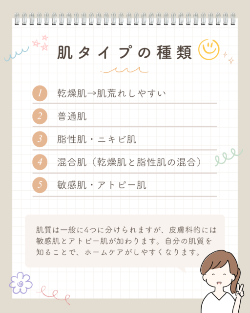 ・混合肌:Tゾーン(額・鼻・あご)はベタつき、頬や目元は乾燥するなど、部分的に肌質が異なる。