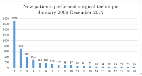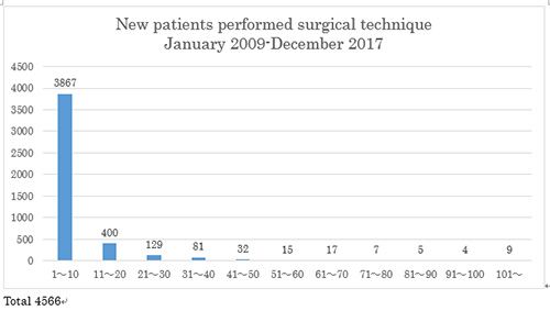 次に2009年から2017年までの9年間に当院でニキビの外科的治療を受けた患者4566人についてこの外科的治療の有用性の研究を行いました。その結果、患者数と治療回数は年次ごとにきれいな逆相関関係を示し治療回数が増えるほど患者数が減っていて外科的治療でニキビが治っていることが示されました。10回、20回、50回の治療で治った患者が4566人のそれぞれ約85%、93%、99%を占めることもわかりました。ただし、この治癒した患者の中には痛みのために治療を中止した患者も含まれると思われるため、4566人中、1回で治療を止めた人1708人(1回で根治した人と痛みのために治療を中止した人が含まれます)を解析から除外して検討してみたところ、10回、20回、50回の治療で治った患者が2858人のそれぞれ約76%、90%、98%を示すこともわかりました。